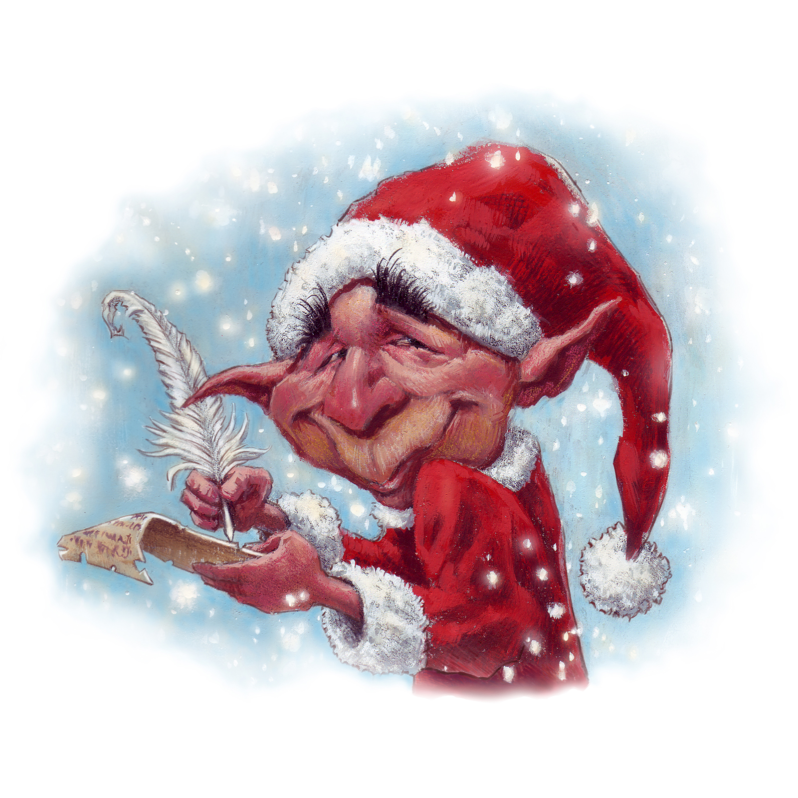 Image Description: • A Christmas Elf painted in gouache on hot press watercolor paper.